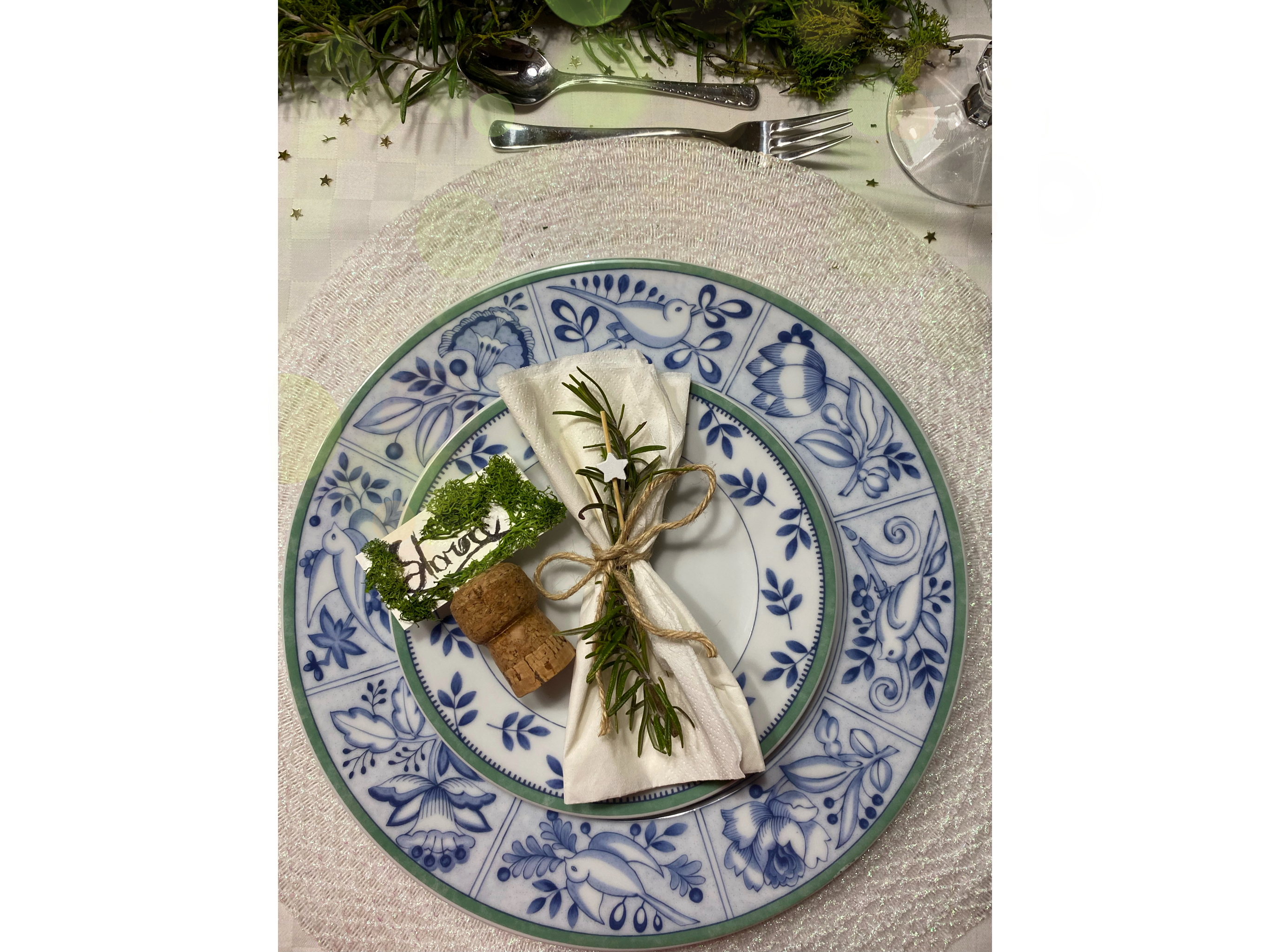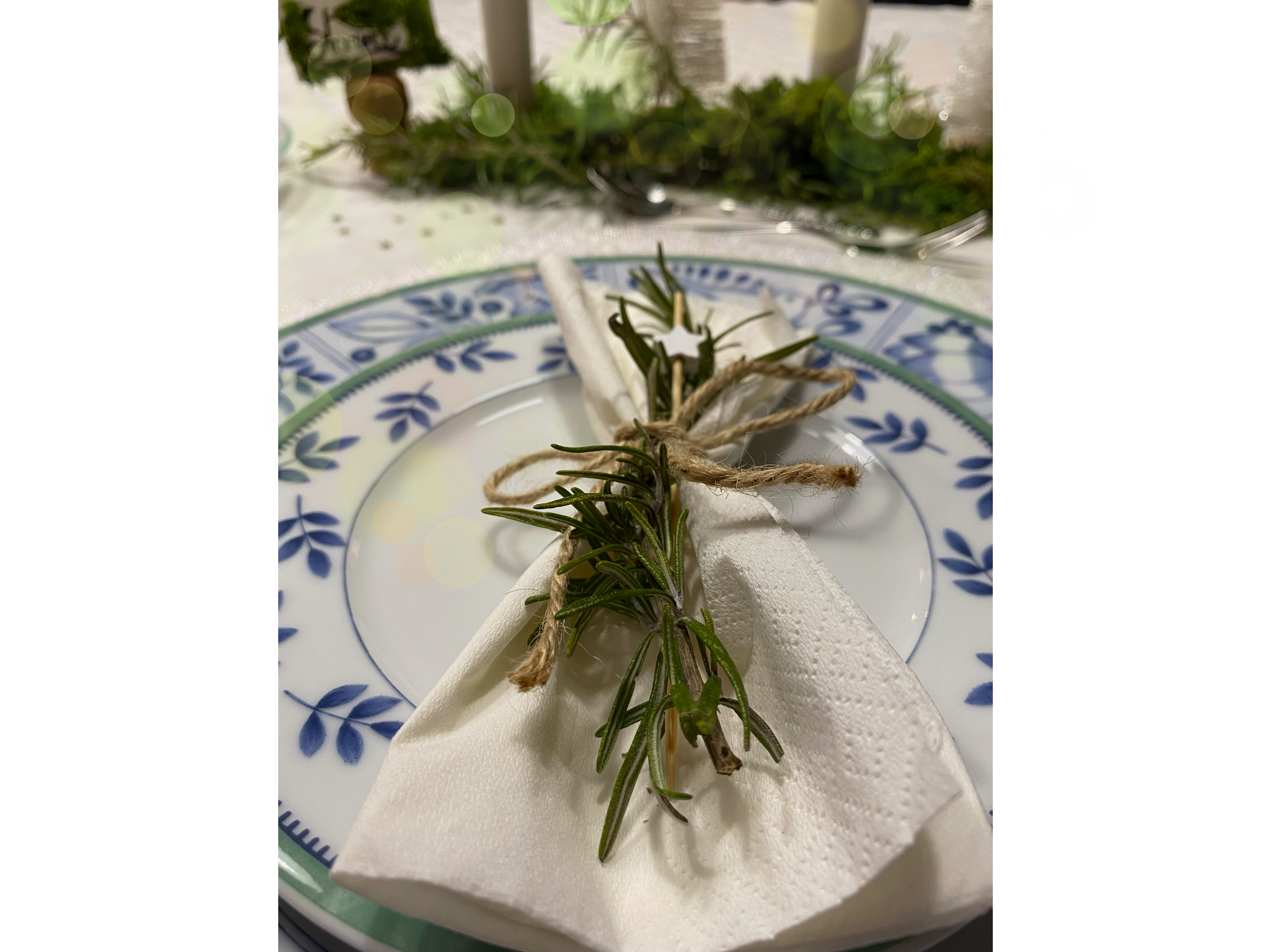 Per il tovagliolo ho preferito utilizzarne uno di carta, in modo tale da essere più igienico, visto il periodo in cui ci troviamo 😅😂 oltre ad essere più reperibile. L’ho legato con un filo di spago, e un rametto di rosmarino che richiama il centrotavola, ho aggiunto anche una piccola stellina che ricorda il capodanno.