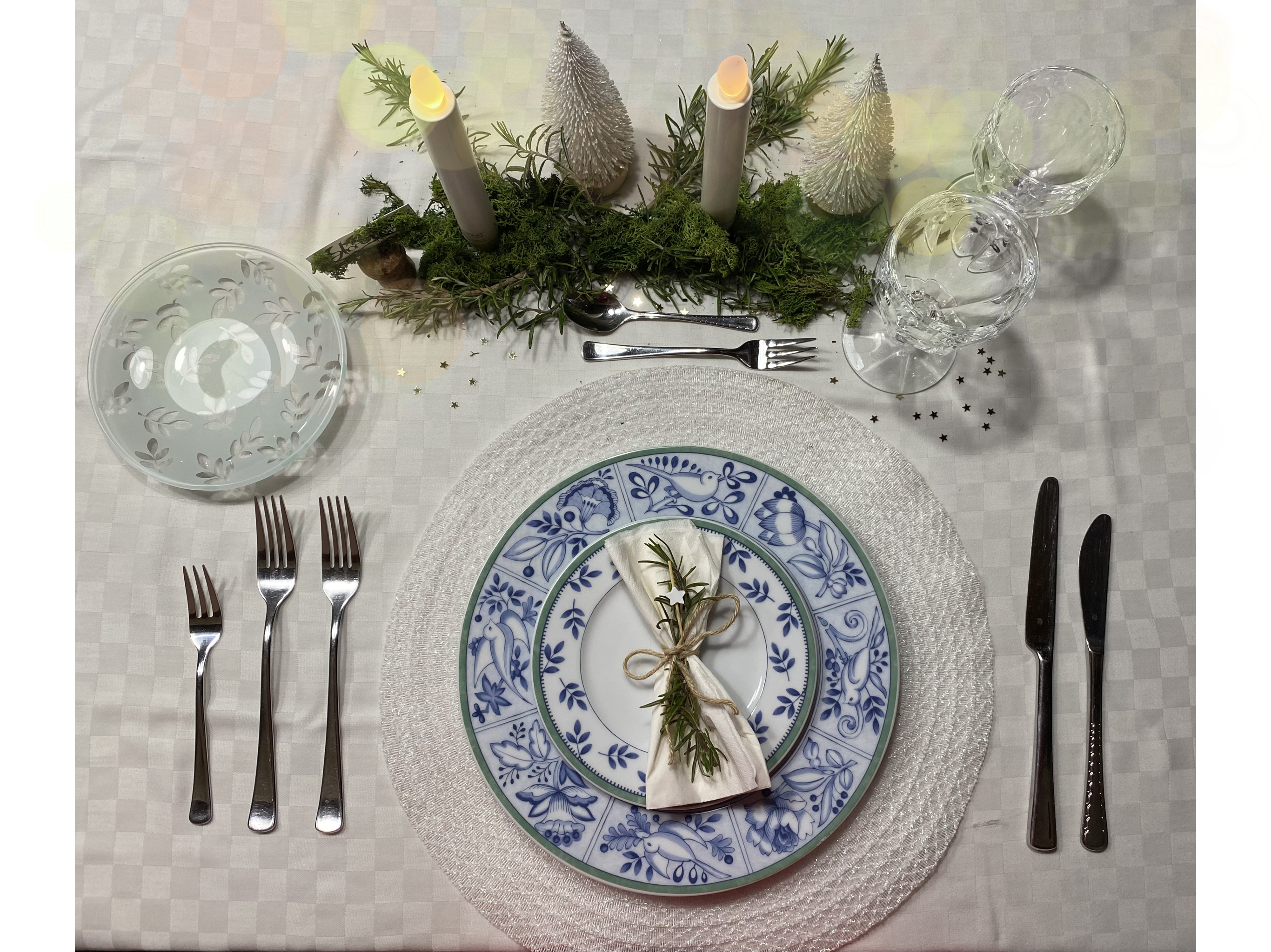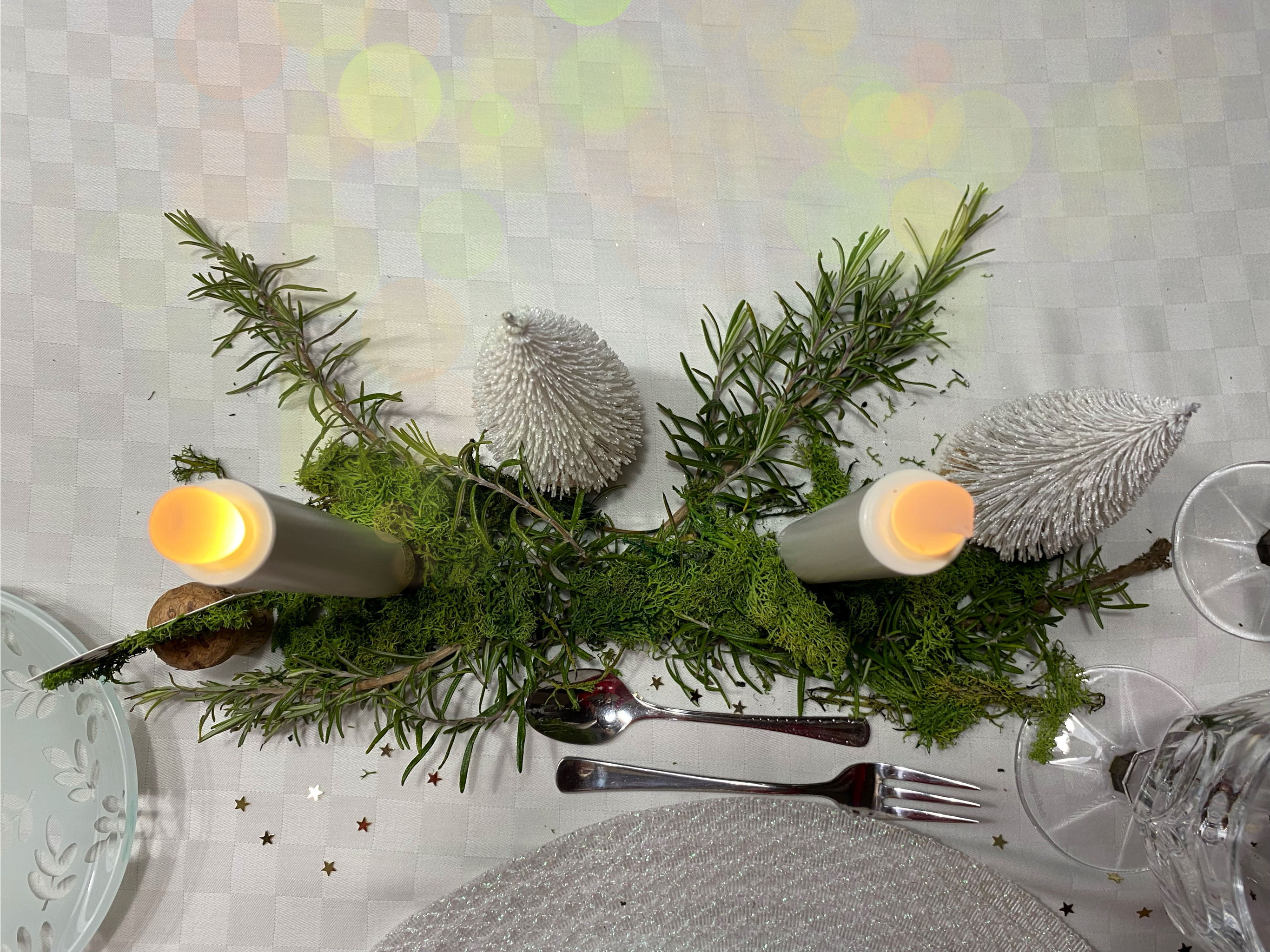 Una mise en place semplice, dai toni verdi, bianchi e un tocco dorato dato dalle stelline sparse sulla tavola. Vi ho voluto portare un esempio creata con elementi comuni, facilmente reperibili, come per esempio i tappi di sughero che possono diventare degli originali segna posto. Il rosmarino fresco e del muschio finto, utilizzato solitamente nei presepi, possono creare una folta vegetazione per un centrotavola perfetto. Nel mio caso ho aggiunto anche due alberi bianchi. Il consiglio che posso darvi è di incollare tutti gli elementi ad una base in legno o su un pezzo di corteccia di un albero, in modo tale che non vada in giro il muschio. Nel mio caso le candele sono state prese dall’Ikea.