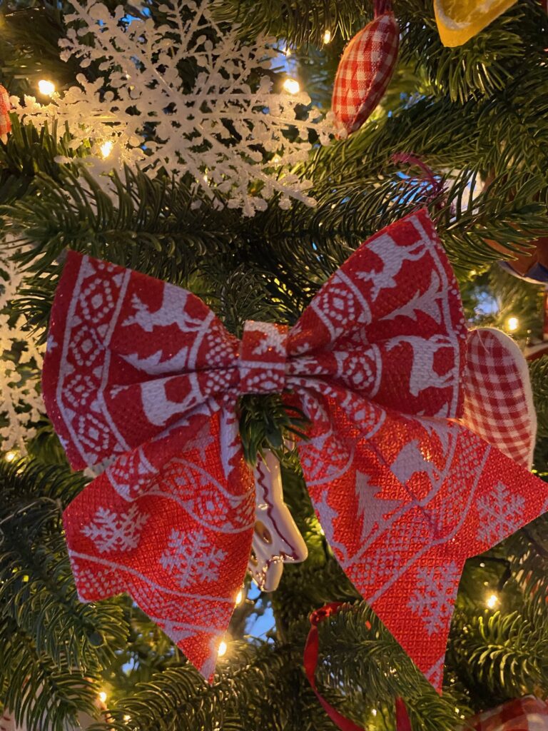 Come puntale ho scelto un fiocco rosso con fantasie nordiche, che richiamano lo stile della casa.