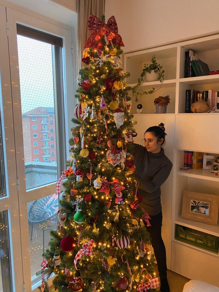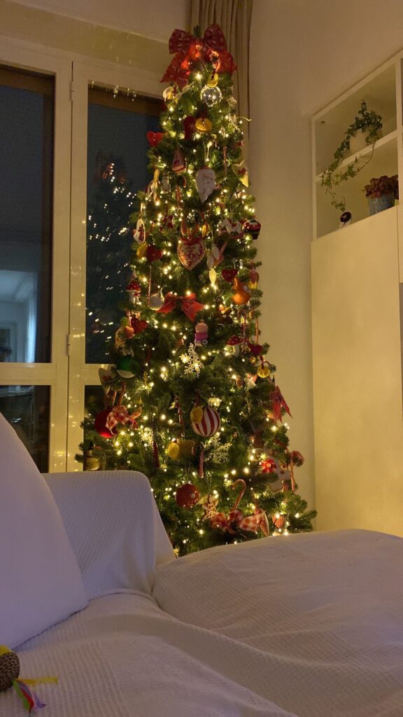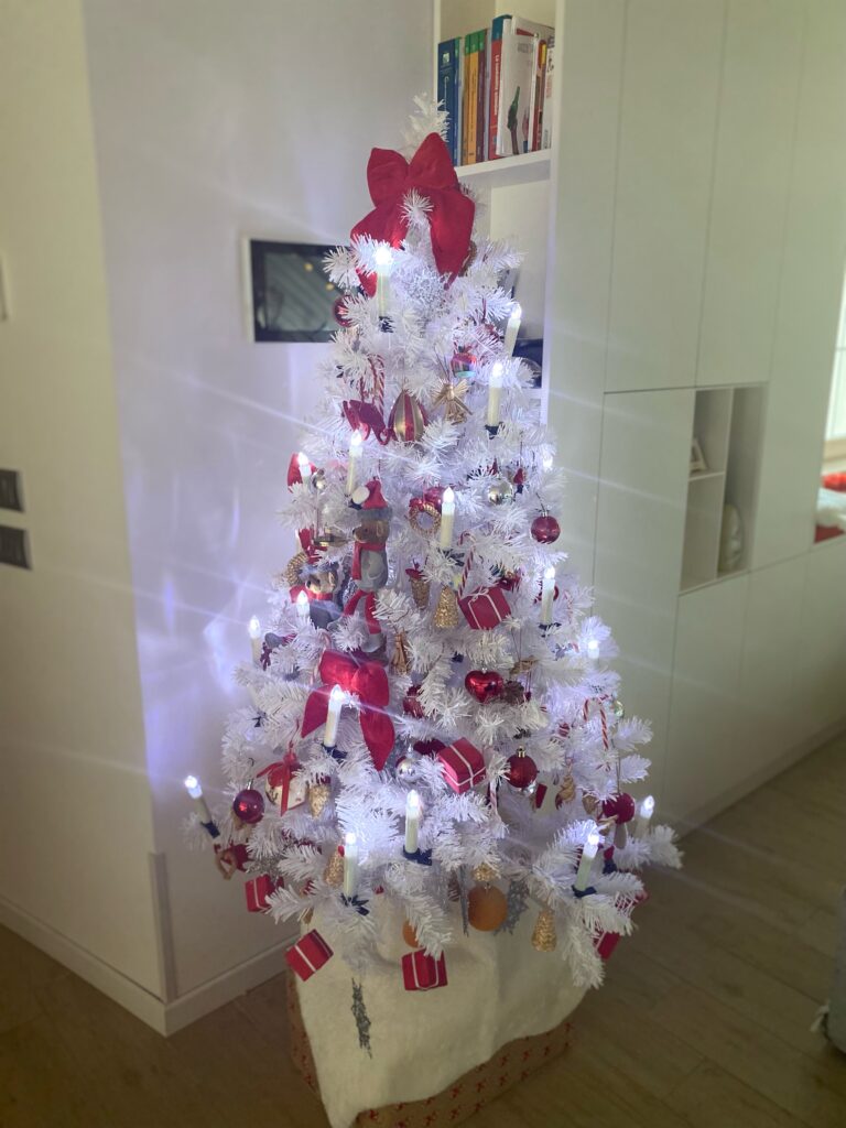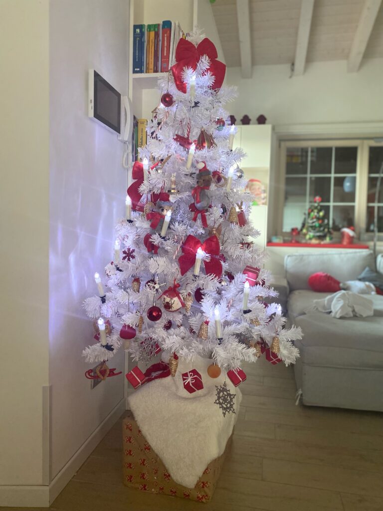 Il valore aggiunto sono le decorazioni realizzate dalla bambina della mia cliente, che rendono l’albero ancora più personale.