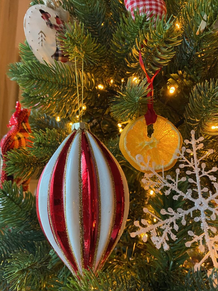 Come potete vedere in questo albero Slim verde, il rosso e il bianco sono i colori predominanti, con un tocco di arancio utilizzando delle semplici arance essiccate, che danno un tocco in più grazie al loro profumo che emanano per tutta la stanza.