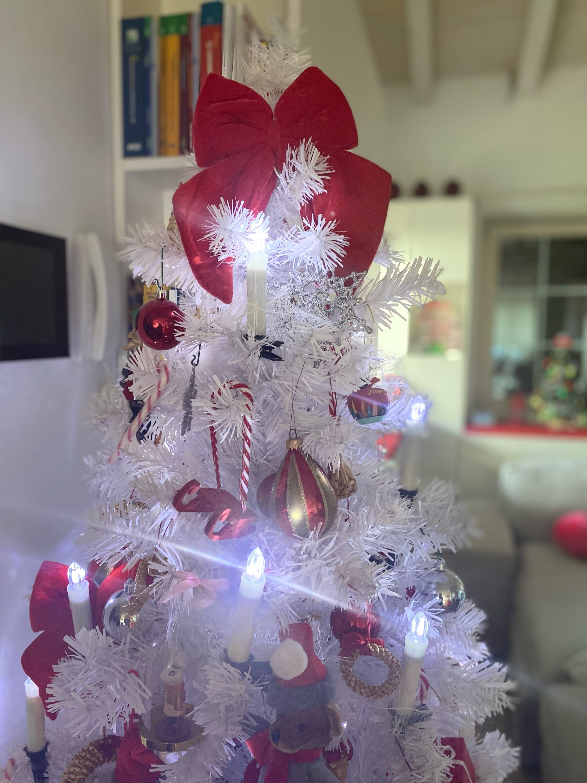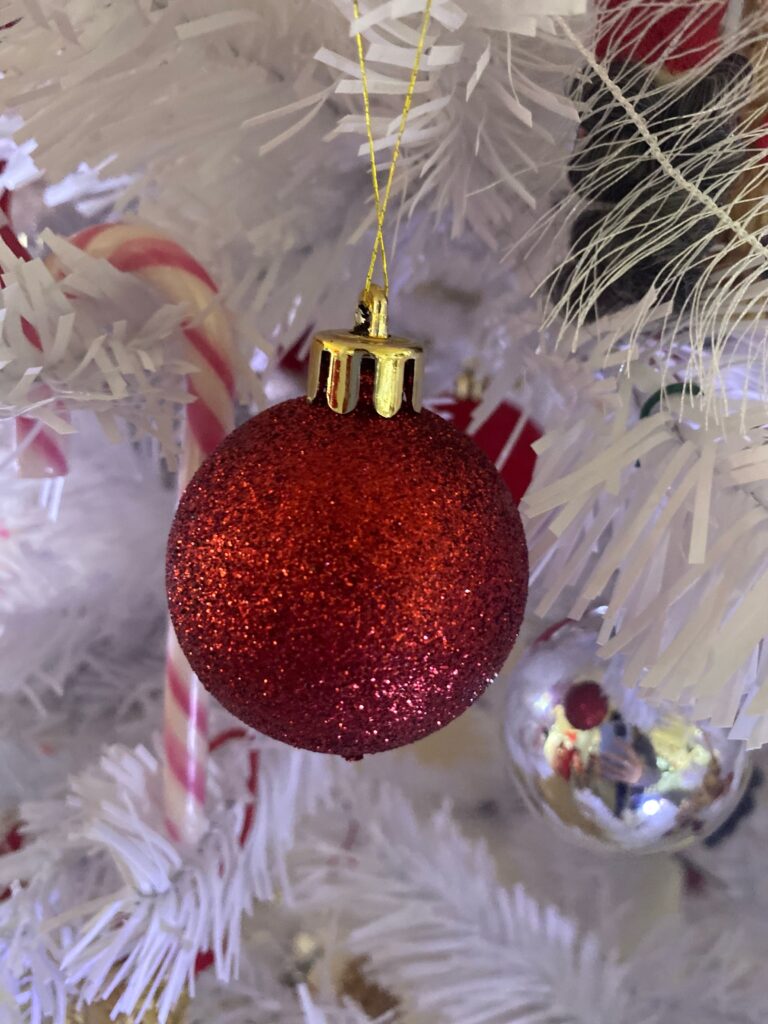 La mia cliente mi ha commissionato l’allestimento di un albero bianco. Ho deciso di utilizzare pochi colori ma decisi: il rosso, l’argento e il bianco, ovvero i colori principali della casa.