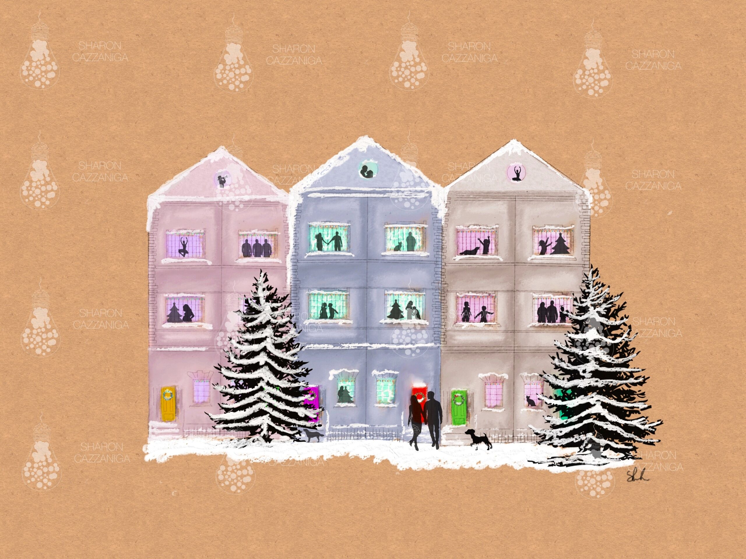 Uno sguardo alla finestra, è una serie di disegni che raffigura una piccola parte di un quartiere straniero rivisitato da me, dove possiamo ammirare dalle finestre scene quotidiane, di felicità e amore, ad esempio chi addobba l’albero, un bacio al pancino di una futura mamma, un bimbo e il suo cagnolino, e tanto altro. Fin da piccola ho sempre amato girare per i quartieri e scrutare scene di tutti i giorni all’interno delle case, come l’arredamento, addobbi natalizi ecc… tutto talmente poetico che ho voluto inserirlo in una serie di miei disegni.