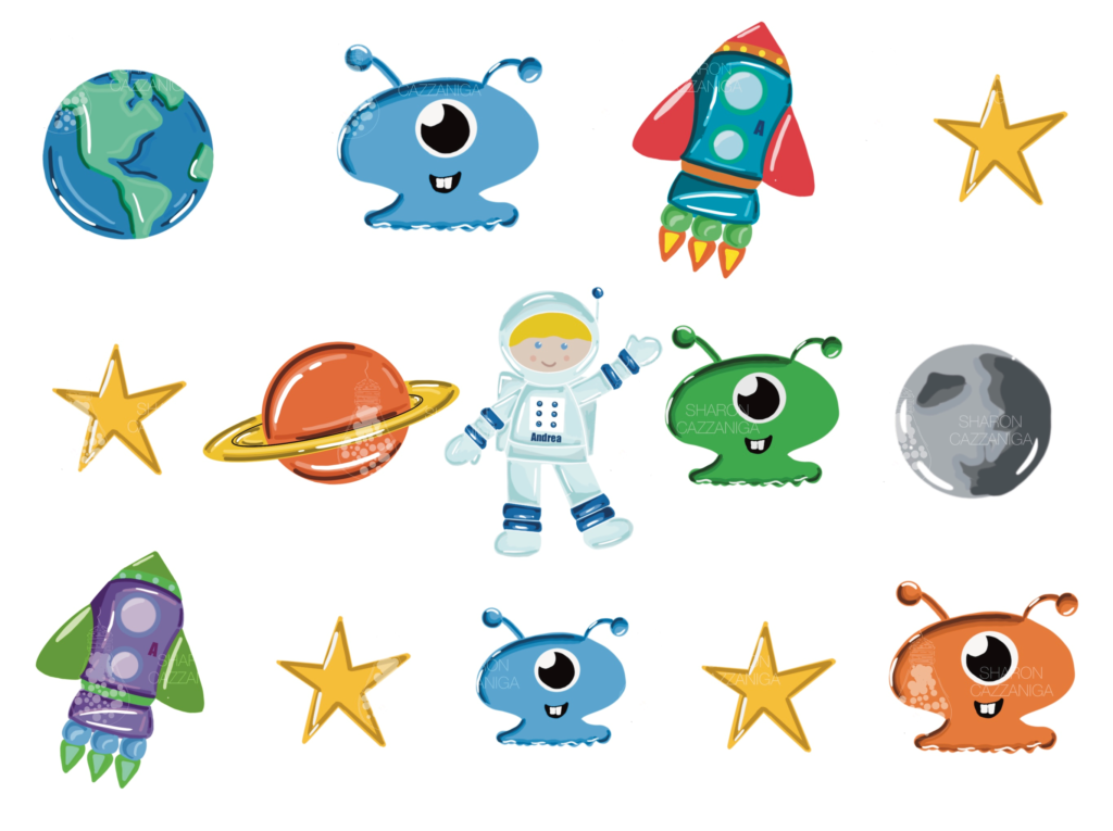 Illustrazioni a tema spazio realizzate per il compleanno del piccolo Andrea su commissione.