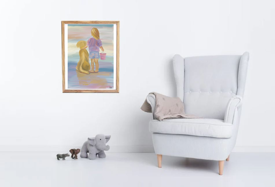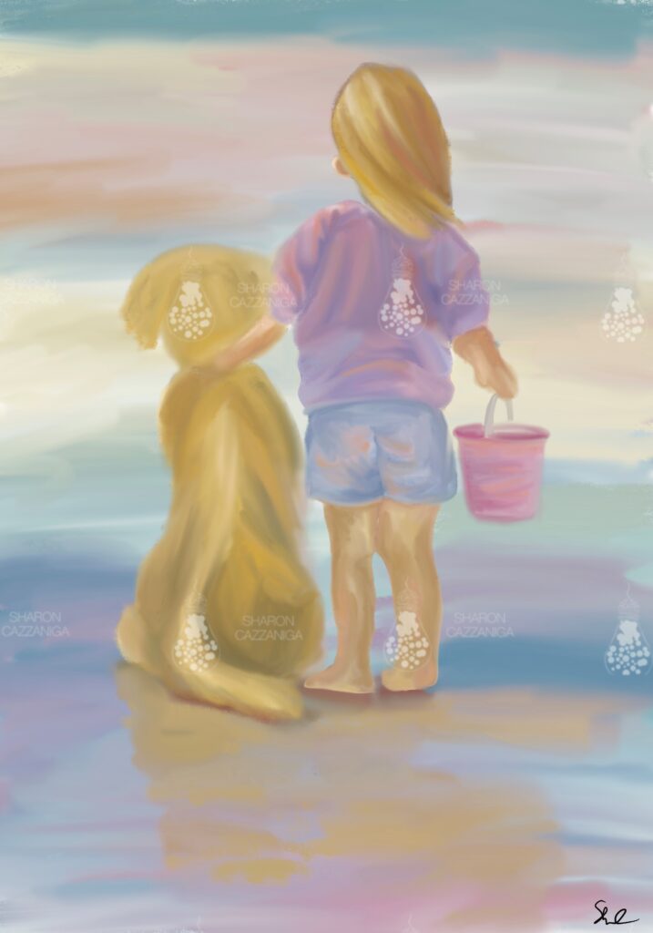 Illustrazione di una bimba con amico a 4 zampe al mare.