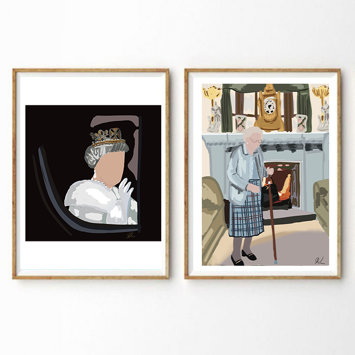 Come omaggio alla regina Elisabetta II, scomparsa 08/09/22 nel castello di Balmoral. Ho voluto condividere due illustrazioni con lei come protagonista. In una raffigurata nella sua ultima apparizione, che gli dona semplicità e leggerezza, quasi da essere vista come la nonna di tutti noi, mentre nella seconda illustrazione è rappresentata in veste di regina adornata da una corona e gioielli preziosi che elevano la sua figura.
