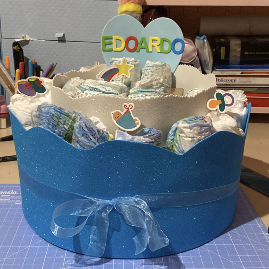 Torta di pannolini realizzata per il piccolo Edoardo, con all’interno un set pappa.