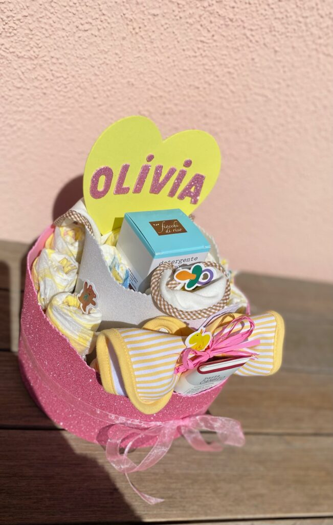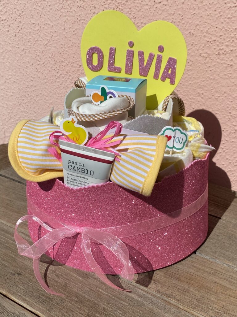Torta di pannolini realizzata per la piccola Beatrice, all’interno possiamo trovare un pagliaccetto piegato a fiocco e un giochino. In basso una fascia rosa, una viola nella parte superiore, e in fine un cuore viola con scritto il nome della bimba, decorazioni sparse e unicorni porta fortuna.