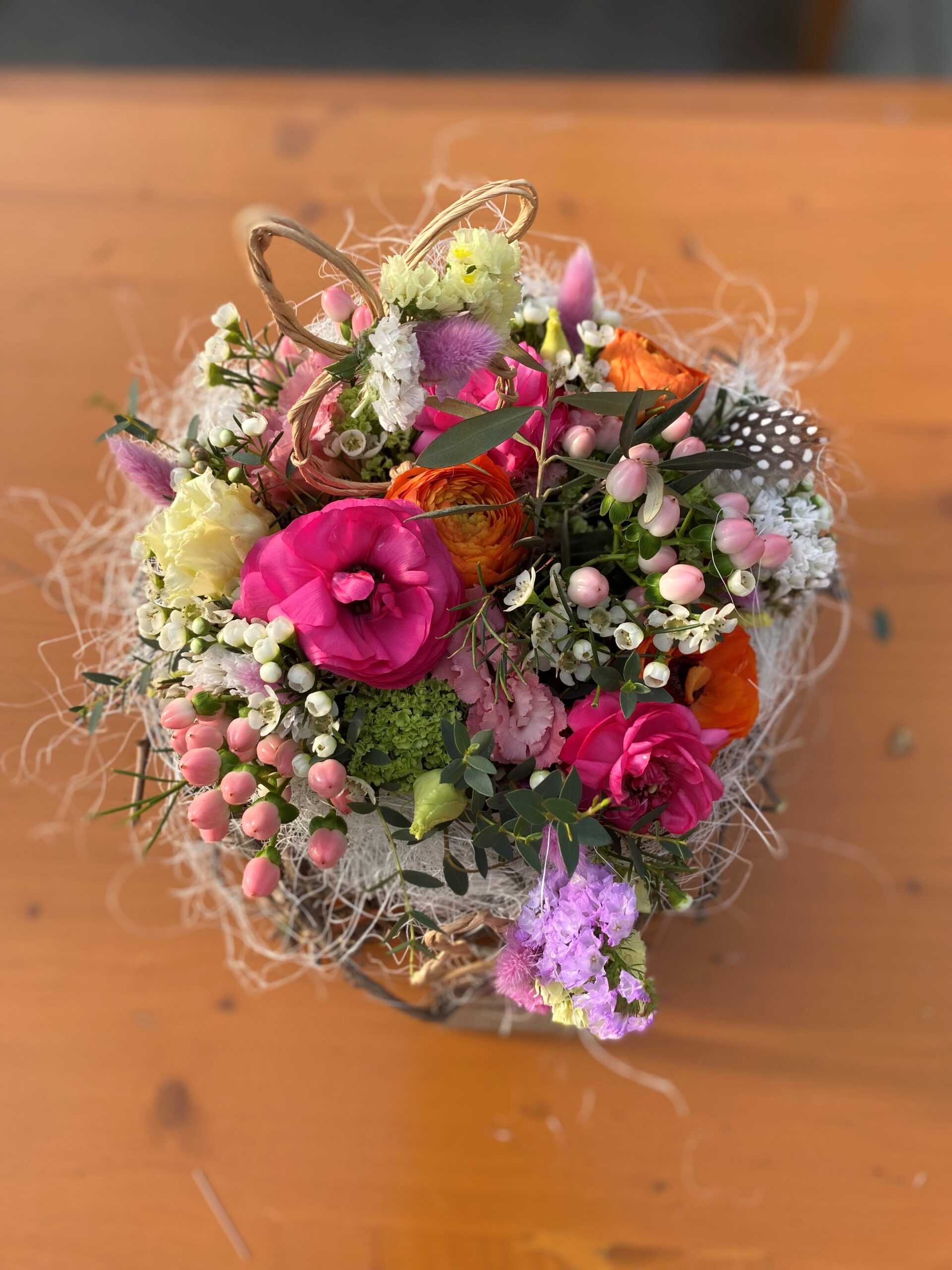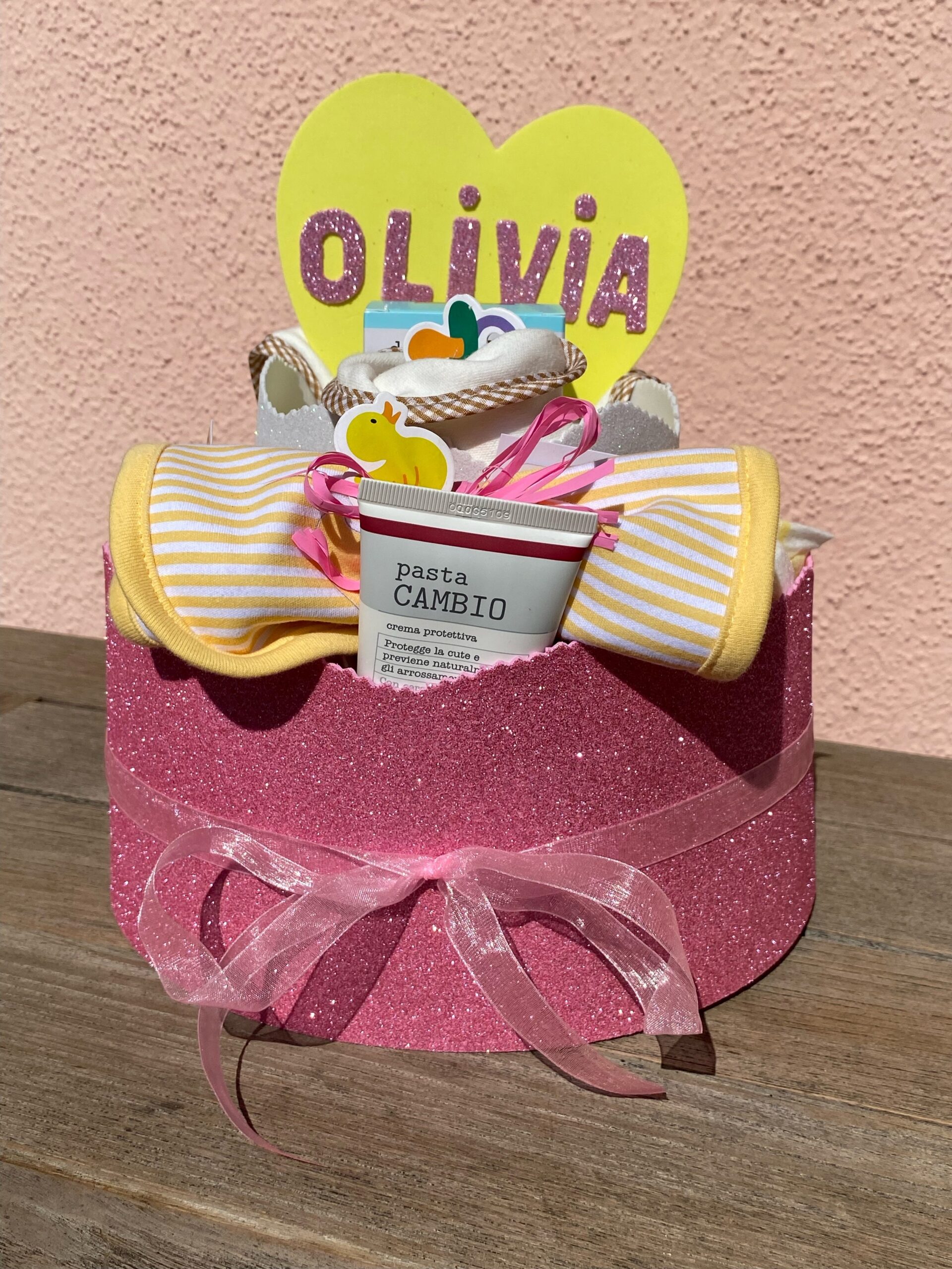 Torta di pannolini realizzata per la piccola Beatrice, all’interno possiamo trovare un pagliaccetto piegato a fiocco e un giochino. In basso una fascia rosa, una viola nella parte superiore, e in fine un cuore viola con scritto il nome della bimba, decorazioni sparse e unicorni porta fortuna.